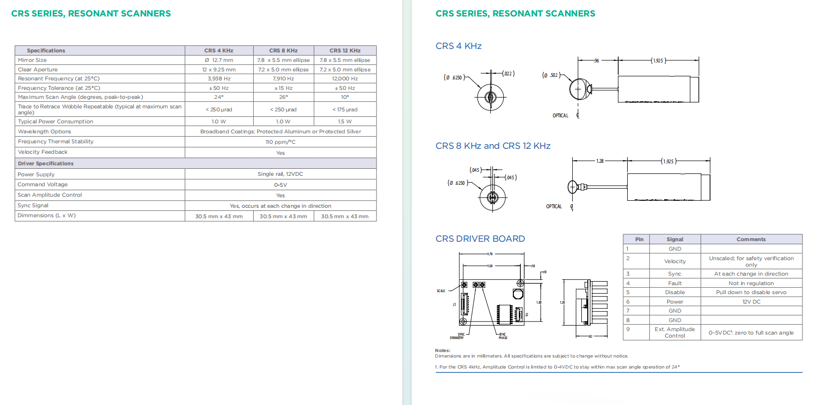 Engineered by Cambridge Technology, our CRS Series of novel resonant scanners are ideally suited for highspeed imaging in real time. The CRS oscillates at a fixed, resonant frequency with a sinusoidal waveform; this unique scanner design enables a rapid scanning rate. The mirror is engineered out of lightweight beryllium, and broadband coatings reflect a wide range of laser wavelengths. When paired with a galvanometer, the CRS enables high-speed raster scanning over a twodimensional field and is well-suited for microscopy and scanning laser ophthalmology applications.
